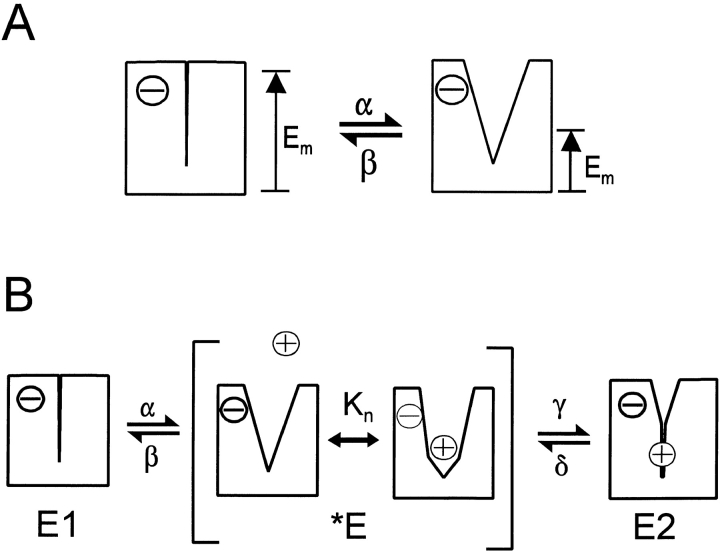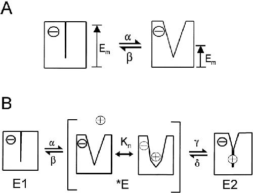 Figure 2. Hypothetical mechanisms of GAT1 electrogenicity. (A) Binding site opening reaction of an empty transporter. It is assumed that opening of the binding site changes the membrane potential profile across the transporter, such that the membrane electrical field moves across the charged binding site. The charge of the binding site, while open, remains outside the electrical field. Therefore, the binding site opening rate (α) will be more strongly voltage dependent than the closure rate (β). (B) Hypothetical mechanism of electrogenicity during Na+o occlusion by the GAT1 transporter. In the E1 state, binding sites are closed to the extracellular side. When they open, one Na+ can bind in the *E state, and the transporter binding sites close to the E2 state with an occluded Na+. In the opening reaction, the membrane field moves partially across the negatively charged binding site, and in the closing reaction, the membrane field moves in the opposite direction across the bound Na+. See text for further explanations. |
