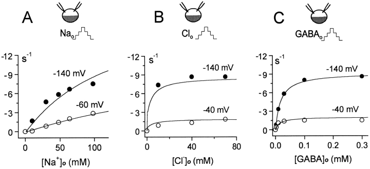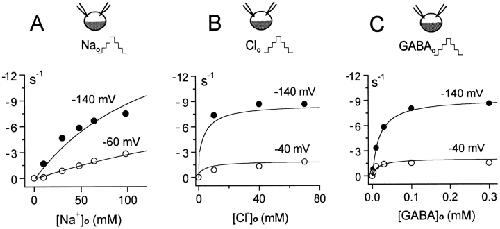 Figure 7. Extracellular substrate dependence of inward GAT1 current. (A) Extracellular Na+ dependence of current at −140 and −60 mV. (B) Extracellular Cl− dependence of current at −140 and −40 mV. (C) Extracellular GABA dependence of current at −140 and −40 mV. The experimental results are whole-oocyte currents (Mager et al. 1993). See text for further details. |