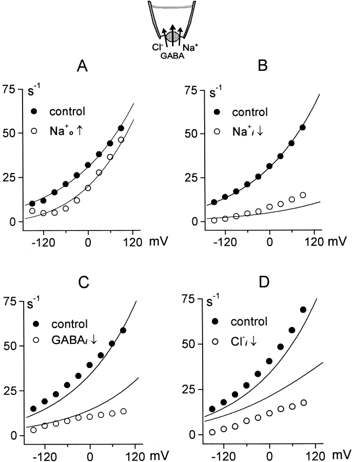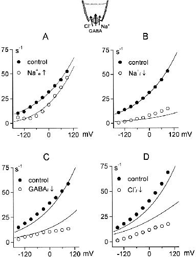Figure 6. Current–voltage relations of outward GAT1 current. Fully activated outward current (120 mM NaCl and 20 mM GABA) is plotted in each case (•). (A) Inhibition of outward current by 100 mM extracellular Na+. (B) Inhibition of outward current by reducing the cytoplasmic Na+ concentration from 120 to 20 mM. (C) Inhibition of outward current by reducing cytoplasmic GABA from 20 to 0.5 mM. (D) Inhibition of outward current by reducing cytoplasmic Cl− from 120 to 15 mM. See text for further details. |