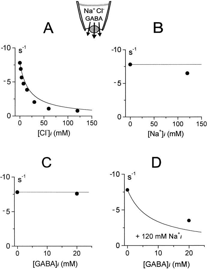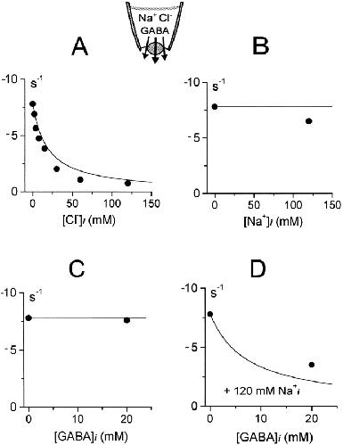 Figure 8. Cytoplasmic substrate dependence of inward GAT1 current. (A) Inhibition of inward GAT1 current by cytoplasmic Cl−. (B) Weak inhibition of inward GAT1 current by cytoplasmic Na+. (C) Lack of effect of GABAi on inward GAT1 current. (D) Weak inhibition of inward GAT1 current by GABAi in the presence of 120 mM cytoplasmic Na+ and no Cl−. See text for further details. |