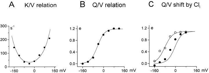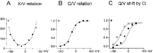 Figure 11. Rate– (K/V) and charge–voltage (Q/V) relations. (A and B) Results from an excised oocyte patch with 40 mM extracellular NaCl, simulated with 80 mM NaCl. (C) Effect of 120 mM cytoplasmic Cl− on Q/V relation of a patch with 120 mM extracellular NaCl. The simulated charge is calibrated as elementary charges (e) moved through membrane field per single transporter. See text for details. |
