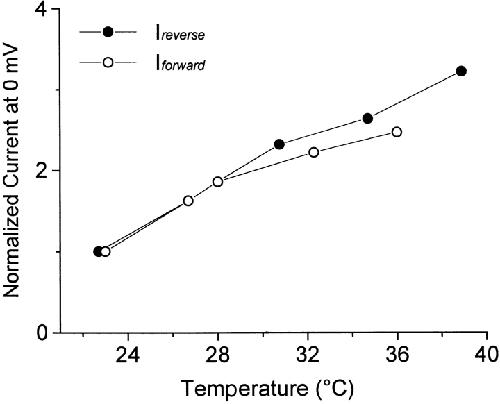 Figure 12. Temperature dependence of inward and outward GAT1 currents at 0 mV in excised oocyte patches. Inward current was recorded with 120 mM NaCl and 0.2 mM GABA on the extracellular side. Outward current was recorded with 120 mM NaCl and 20 mM GABA on the cytoplasmic side. |