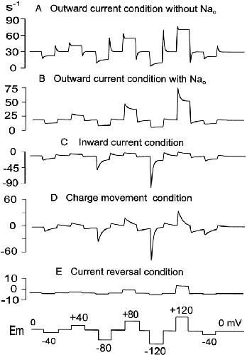 Figure 15. Predicted GAT1 pre–steady state current transients. The voltage protocol is given below the figure. These model results are comparable to experimental results described previously (Lu and Hilgemann 1999b). (A) Outward current condition without extracellular Na+: 120 mM cytoplasmic NaCl, 20 mM cytoplasmic GABA, and 20 mM extracellular Cl−. (B) Outward current condition as in A with additional 120 mM extracellular Na+. (C) Inward current condition: 120 mM extracellular NaCl, 0.2 mM extracellular GABA, and no cytoplasmic substrates. (D) Charge movement condition: 120 mM extracellular NaCl and no other GAT1 substrates. (E) Current reversal condition: 120 mM NaCl and 2 mM GABA on the extracellular side; 120 mM Na+, 6 mM Cl−, and 2 mM GABA on the cytoplasmic side. See text for complete details. |