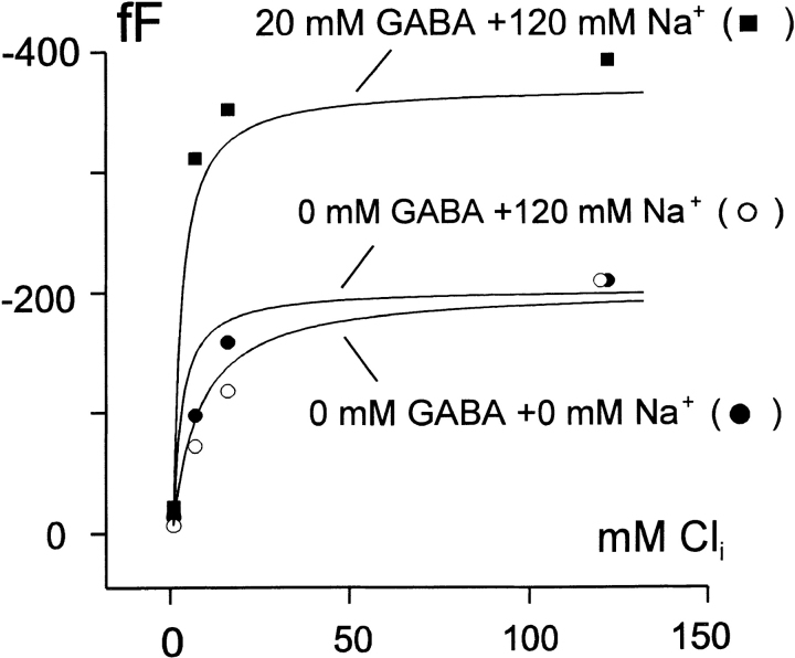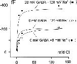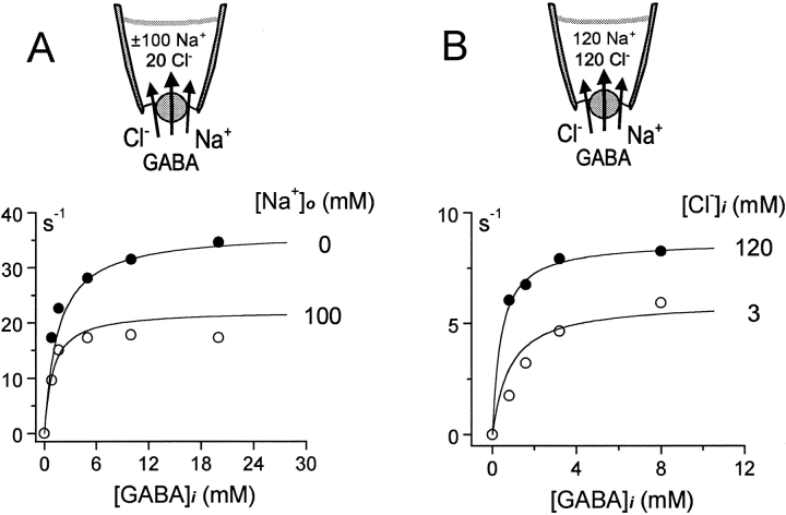 Figure 4. (A) GABA dependence of the outward transport current at 0 mV in the presence of 120 mM cytoplasmic Cl−, with and without 120 mM extracellular Na+. See text for details. (B) GABA dependence of the outward transport current at 0 mV in the presence of 120 mM extracellular NaCl, with 120 and 3 mM cytoplasmic Cl−. |