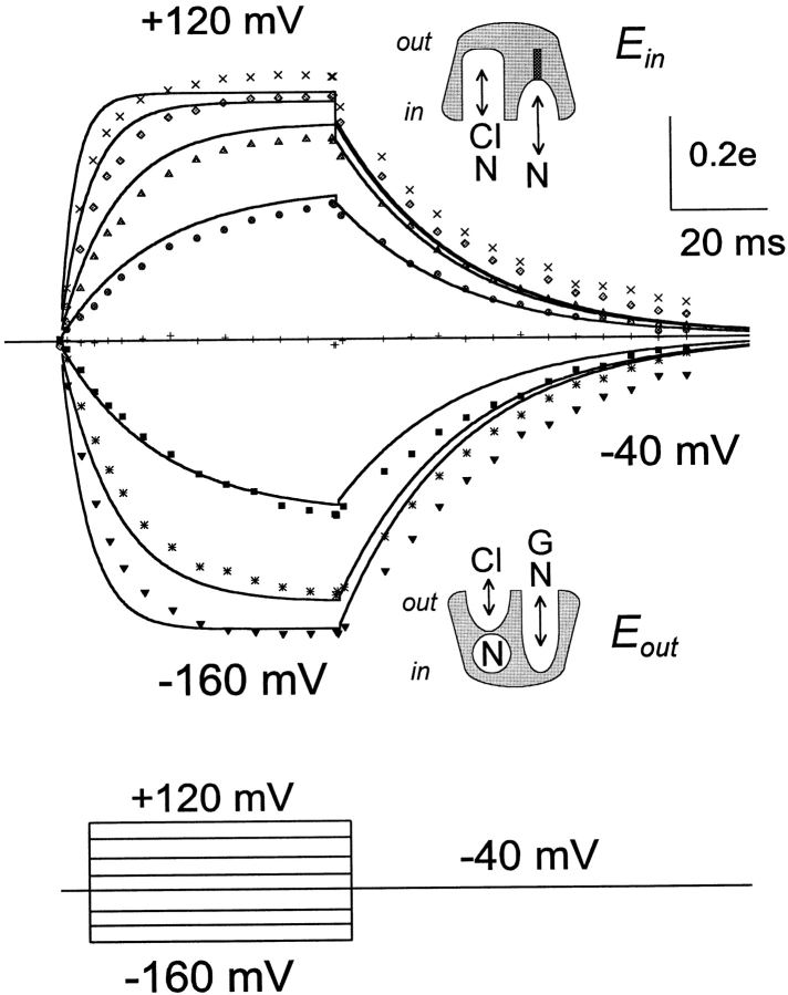 Figure 10. Simulated and measured GAT1 charge movements. The simulation is calibrated as elementary charges (e) moved through membrane field per single transporter. The experimental results are with 40 mM extracellular NaCl; the simulation is with 80 mM extracellular NaCl. As indicated by the cartoons, binding sites are expected to be open to the cytoplasmic side at positive potentials and to the extracellular side at negative potentials. See text for more explanations. |
