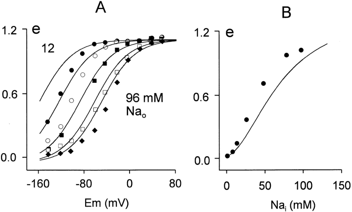 Figure 14. Voltage and extracellular Na+ dependence of GAT1 charge movements in whole-oocyte voltage clamp. The simulations are calibrated as elementary charges (e) moved through membrane field per single transporter. The results are from Mager et al. 1996. (A) Voltage dependence of charge moved at 96 (♦), 77 (□), 48 (▪), 24 (○), and 12 (•) mM extracellular Na+. (B) Na+i dependence of charge moved at −80 mV by application of 96 mM extracellular Na+. |