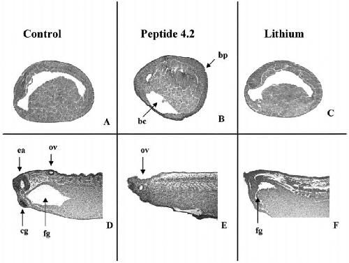 prominent cement gland. For both peptide 4.2- and LiCl-injected embryos, there was an absence of eyes and cement gland. Moreover,