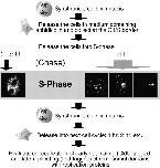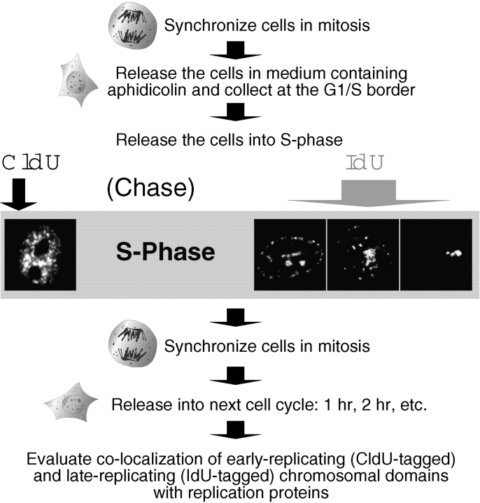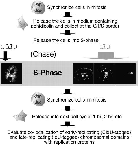 Figure 1. Experimental protocol (see text for details). Representative photographs of the types of replication patterns prevailing in the early (first half, euchromatic) or late (second half, three sequential heterochromatic patterns) stages of the 10–12 h S-phase in CHOC 400 cells are displayed.
