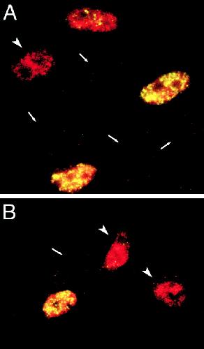 Figure 8. Hamster RPA and PCNA are assembled into detergent-resistant replicative complexes within less than an hour from the start of S-phase. CHOC 400 cells, synchronized in mitosis, were released for 8 h in the following cell cycle (20% of the cells had entered S-phase at this time). The cells were pulse-labeled with 100 μM CldU for 1 min, extracted with Triton and fixed with formaldehyde as described in Materials and Methods. Aliquots of the cells were stained with anti-CldU antibodies (green) and either anti-RPA antibodies (red, A) or anti-PCNA antibodies (red, B). S-phase cells display yellow coloration resulting from the colocalization of RPA or PCNA (red) with nascent DNA (CldU, green). Arrowheads point to nuclei that exhibit positive staining for RPA or PCNA, but no CldU label. Arrows indicate the positions of G1-phase cells (barely visible as faint shadows).