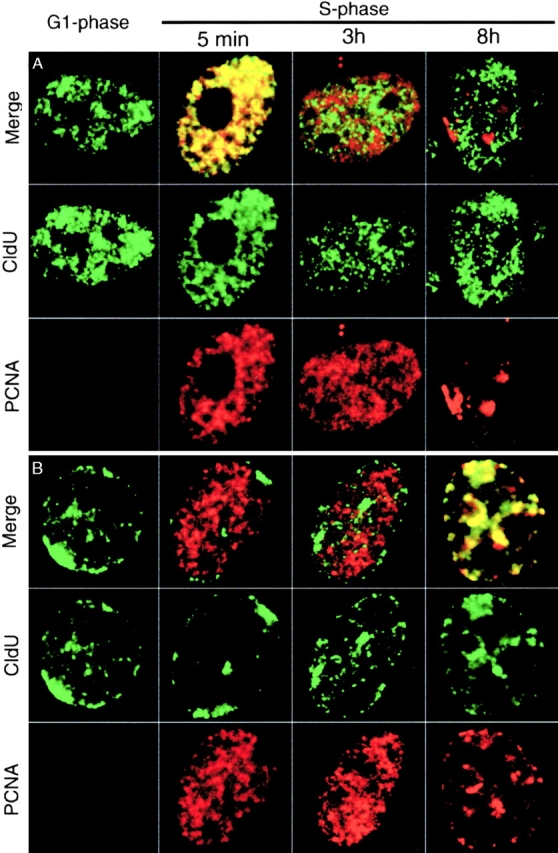 Figure 3. PCNA does not bind nuclear components during G1-phase and associates transiently with chromosomal domains at the time when they replicate. (A) The association of PCNA (red) with the earliest-replicating chromatin regions (CldU-tagged, green) was examined in aliquots of the cells used in the experiment displayed in Fig. 2. (B) Late-replicating genomic regions were pulse-labeled with CldU (green) at 8 h in S-phase in a parallel culture of CHOC 400 cells, mitotic cells were collected few hours later, released in the subsequent cell cycle for the same periods of time and processed in the same way as in Fig. 2.
