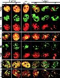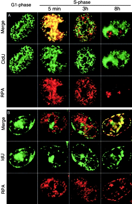 Figure 6. Hamster RPA does not assemble into detergent-resistant pre-RC foci during early G1-phase and associates transiently with chromosomal domains at the specific time of S-phase when they replicate. The association of RPA (red), with earliest-replicating (CldU, green, A) or late-replicating (IdU, green, B) chromatin regions was examined in aliquots of the cells used in Fig. 2. Immunolabeling was performed as in Fig. 2.