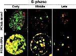 Figure 4. RPA, but not Mcm2, is present at PCNA-containing active mammalian replication forks. Aliquots of the cell cultures (synchronized in early or mid/late S-phase) used in Fig. 2 were immunostained with PCNA-specific (red) and, either Mcm2-specific (A, green), or RPA-specific (B, green) antibodies. Shown are single sections obtained by dual-color confocal laser scanning microscopy.