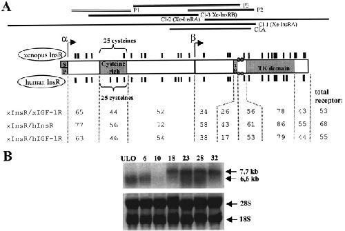 We have identified a member of the insulin receptor (InsR)/insulin-like growth factor-1 receptor (IGF-1R) family. The Xenopus insulin receptor (Xe-InsR) is present as a maternal 6.6 kb transcript. Northern blot analysis reveals the presence of this transcript until the mid-blastula transition (MBT), when levels decrease. At neurulation, two distinct transcripts of 6.6 and 7.7 kb are detected, both of which persist throughout embryogenesis. In situ hybridization analysis shows that InsR expression is restricted to regions of ectodermal and mesodermal origin, notably the encephalon, otic vesicles, optic vesicles, gills, somites and the pronephros.