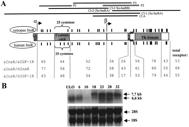 Fig. 1. Characterization of the Xenopus InsR mRNA. (A) Schematic representation of the cloned InsR cDNAs (black lines) and comparison of the deduced