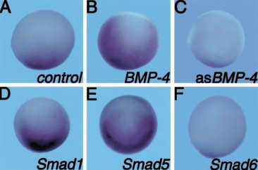 Fig. 7. Regulation of Xvex-1 expression by BMP-4. In order to study the regulatory effect of BMP-4 on Xvex-1 expression RNA encoding different elements of the BMP-4 signaling pathway was injected in all four blastomeres of four-cell embryos. At stage 11 the embryos were processed for whole mount in situ hybridization and probed with the Xvex-1 specific probe. (A) Control embryo exhibiting normal Xvex-1 expression. (B) Embryo injected with BMP-4 mRNA exhibiting expanded expression of Xvex-1. (C) Injection of antisense BMP-4 RNA results in the downregulation of Xvex-1 expression. (D) Embryo injected with the BMP-specific Smad1 mRNA shows expansion in the domain of Xvex-1 expression. (E) Overexpression of Smad5 also results in the upregulation of Xvex-1 expression and its dorsal expansion. (F) Embryo injected with the BMP-specific inhibitory Smad6 results in the downregulation of Xvex-1 expression.