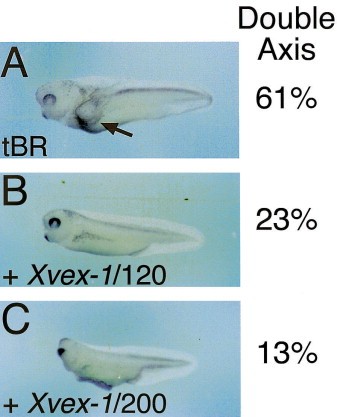 Fig. 8. Xvex-1 can rescue the loss of BMP signaling. Co-injection experiments were performed to determine whether Xvex-1 can rescue the loss of BMP signaling induced by overexpression of the dominant negative BMP receptor. Embryos were injected ventrally with the different mRNAs and subsequently scored for the formation of secondary axes. (A) Embryo injected with 200 pg of mRNA encoding the dominant negative BMPreceptor. (B) Embryo co-injected with 200 pg of dominant negative BMPreceptor RNA together with 120 pg of Xvex-1 mRNA. (C) Embryo injected with 200 pg of dominant negative BMPreceptor mRNA and 200 pg of Xvex-1 sense RNA. The percentage of embryos with secondary axes are shown.