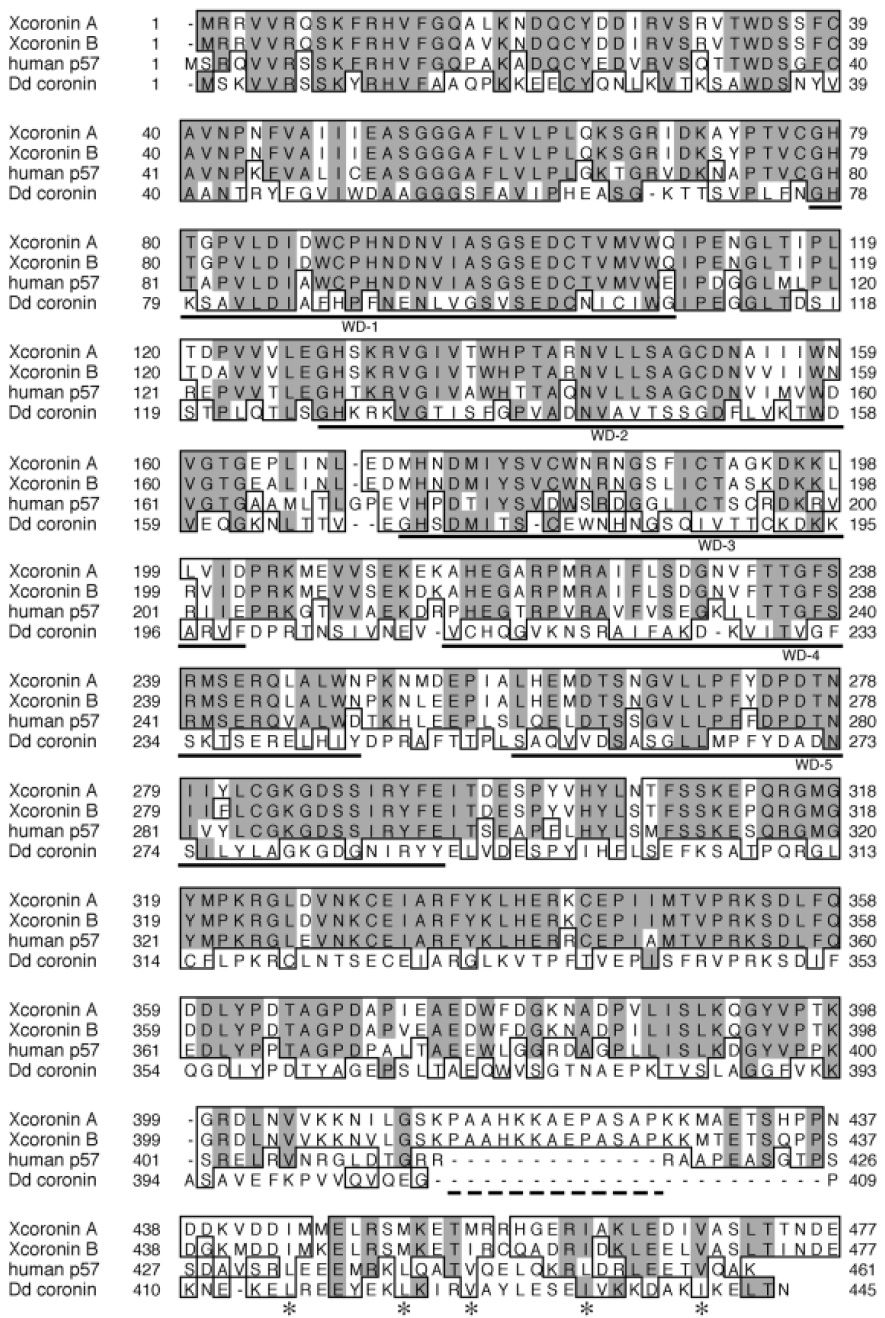 Coronin is a WD repeat-containing actin-binding protein, which was originally identified in the cellular slime mold Dictyostelium. Coronin-null Dictyostelium cells show defects in cytokinesis, cell motility and phagocytosis. Although the existence of coronin in higher eukaryotes has been reported, its function in vertebrate cells has not been elucidated. We cloned a Xenopus homolog of coronin (Xcoronin) and examined its actin-binding properties, subcellular localization and possible functions. Xcoronin consists of 480 amino acids and is 63% identical to human coronin (p57). Bacterially expressed recombinant Xcoronin co-sedimented with F-actin in vitro. The WD repeat domain (residues 64-299) alone did not have any affinity for F-actin. Anti-Xcoronin antibodies reacted specifically with a single 57 kDa protein present in an extract of the Xenopus A6 cell line. Indirect immunofluorescent staining of A6 cells revealed that Xcoronin is present in the cytoplasm and concentrated in the cell periphery in membrane ruffles. During spreading after replating or wound healing after scratching a confluent monolayer, Xcoronin became concentrated in the leading edges of lamellipodia. A GFP-fusion protein of Xcoronin showed a subcellular distribution essentially identical to endogenous Xcoronin. The localization of Xcoronin to the cell periphery was resistant to treatment with 0.1% Triton X-100. The deletion of 63 N-terminal amino acids or of 65 C-terminal amino acids abolished the localization of Xcoronin to the cell periphery. Xcoronin expressed in 3T3 fibroblasts was concentrated to the leading edges of lamellipodia induced by active Rac. Remarkably, expression of a truncated form of Xcoronin (64-299), but not of full-length Xcoronin, significantly decreased the rate of cell spreading after replating and markedly inhibited lamellipodium extension induced by active Rac. These results suggest that Xcoronin plays an important role in lamellipodium extension and cell spreading.