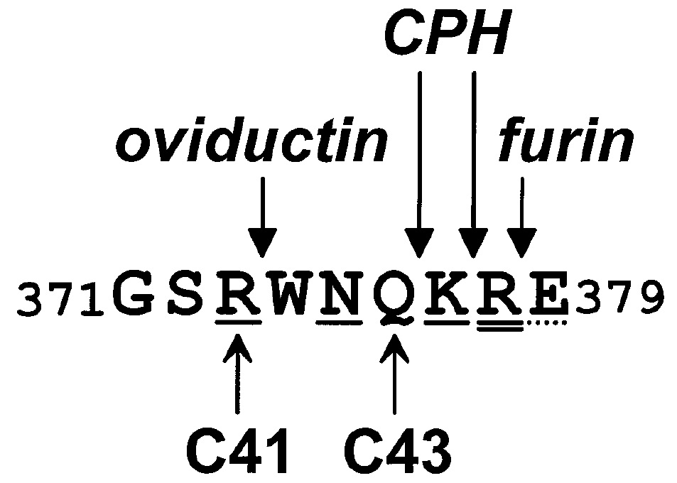 region of gp43 is digested by oviductin at Arg373 in GSR373, resulting