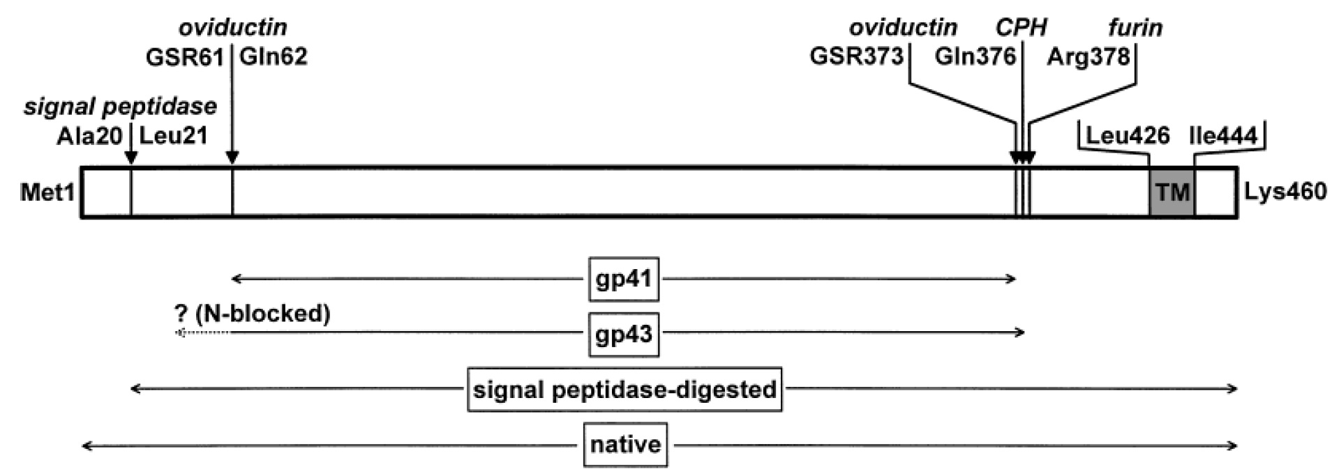 gp43 is first digested at Arg378 (double underline) with a Xenopus