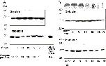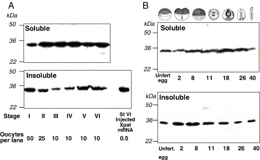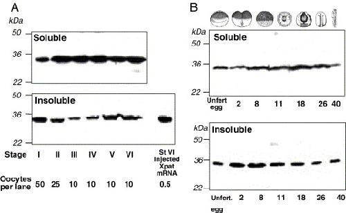 Fig. 1. Xpat protein is present throughout oogenesis and early development. Oocytes (A), eggs and embryos (B) were extracted either in 0.125 M KCl medium and the supernatant analysed by SDS gel electrophoresis and Western blotting, or in 0.5 M KCl and the pellet analysed. In the former extraction, the bulky yolk proteins are insoluble and in the latter they are soluble. A small sample from oocytes injected with 1 ng Xpat mRNA was run in parallel to confirm co-migration with the endogenous band detected (A). |