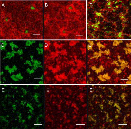 Fig. 5. Xpat-GFP recruits mitochondria. Xpat-GFP is shown in green and mitochondria by staining with TMRE (red) after 2 days incubation. (A, B) Xpat-GFP aggregates in the vegetal hemisphere drew in mitochondria from deeper layers, shown in two optical sections of living oocytes 1.6 μm apart. (C) Anti-VDAC staining (red) of fixed Xpat-GFP-expressing oocytes confirmed this result. (D) In some cases, mitochondria (D′) became integrated into the Xpat-GFP aggregates (D; overlay Dʺ). (E) The same is seen in aggregates formed in the animal hemisphere, after animal mRNA injection and omitting vitellogenin. Scale bars, 20 μm, A–C; 10 μm, D–E. |
