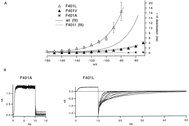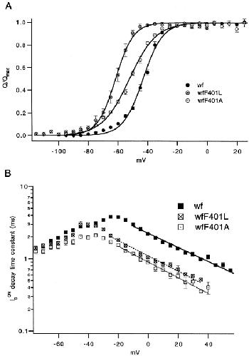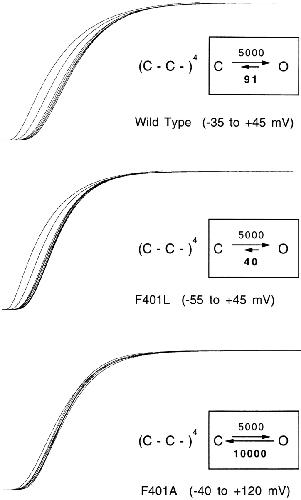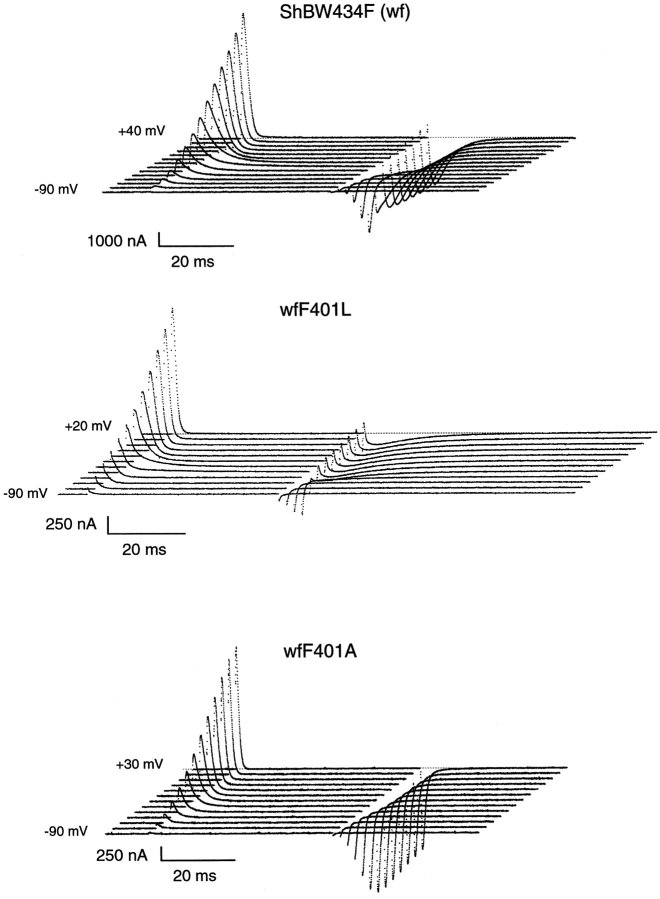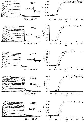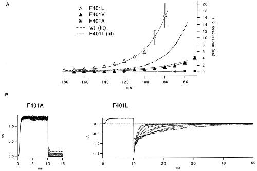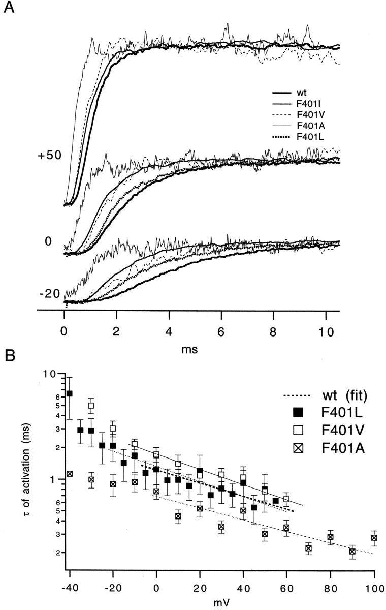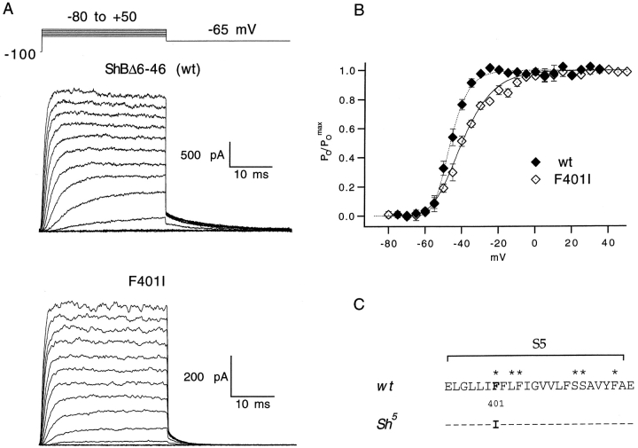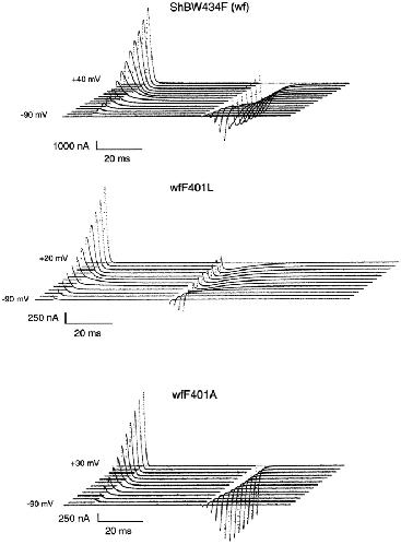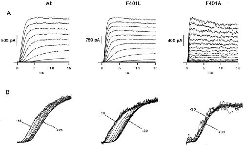 The best-known Shaker allele of Drosophila with a novel gating phenotype, Sh(5), differs from the wild-type potassium channel by a point mutation in the fifth membrane-spanning segment (S5) (Gautam, M., and M.A. Tanouye. 1990. Neuron. 5:67-73; Lichtinghagen, R., M. Stocker, R. Wittka, G. Boheim, W. Stühmer, A. Ferrus, and O. Pongs. 1990. EMBO [Eur. Mol. Biol. Organ.] J. 9:4399-4407) and causes a decrease in the apparent voltage dependence of opening. A kinetic study of Sh(5) revealed that changes in the deactivation rate could account for the altered gating behavior (Zagotta, W.N., and R.W. Aldrich. 1990. J. Neurosci. 10:1799-1810), but the presence of intact fast inactivation precluded observation of the closing kinetics and steady state activation. We studied the Sh(5) mutation (F401I) in ShB channels in which fast N-type inactivation was removed, directly confirming this conclusion. Replacement of other phenylalanines in S5 did not result in substantial alterations in voltage-dependent gating. At position 401, valine and alanine substitutions, like F401I, produce currents with decreased apparent voltage dependence of the open probability and of the deactivation rates, as well as accelerated kinetics of opening and closing. A leucine residue is the exception among aliphatic mutants, with the F401L channels having a steep voltage dependence of opening and slow closing kinetics. The analysis of sigmoidal delay in channel opening, and of gating current kinetics, indicates that wild-type and F401L mutant channels possess a form of cooperativity in the gating mechanism that the F401A channels lack. The wild-type and F401L channels' entering the open state gives rise to slow decay of the OFF gating current. In F401A, rapid gating charge return persists after channels open, confirming that this mutation disrupts stabilization of the open state. We present a kinetic model that can account for these properties by postulating that the four subunits independently undergo two sequential voltage-sensitive transitions each, followed by a final concerted opening step. These channels differ primarily in the final concerted transition, which is biased in favor of the open state in F401L and the wild type, and in the opposite direction in F401A. These results are consistent with an activation scheme whereby bulky aromatic or aliphatic side chains at position 401 in S5 cooperatively stabilize the open state, possibly by interacting with residues in other helices.