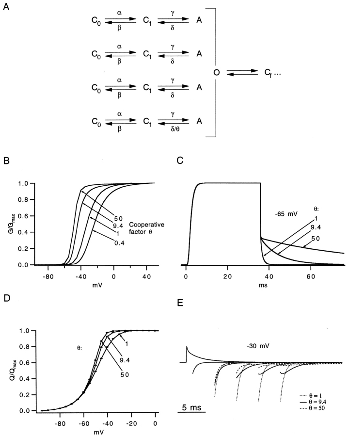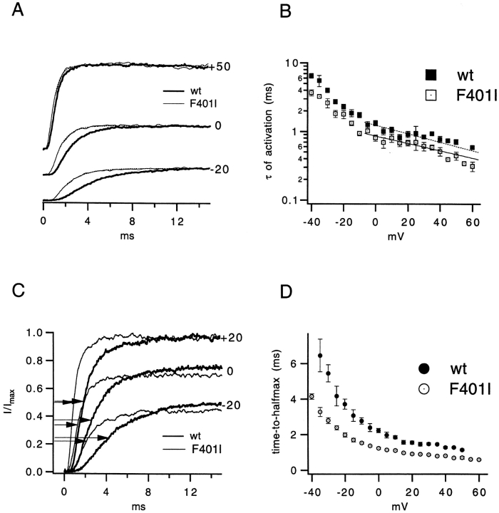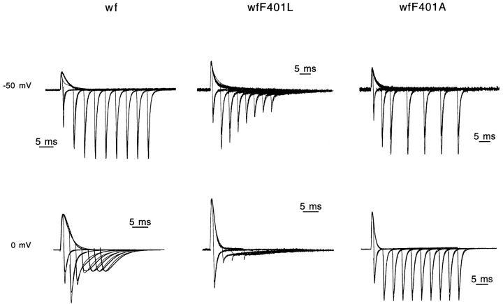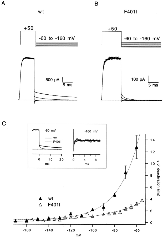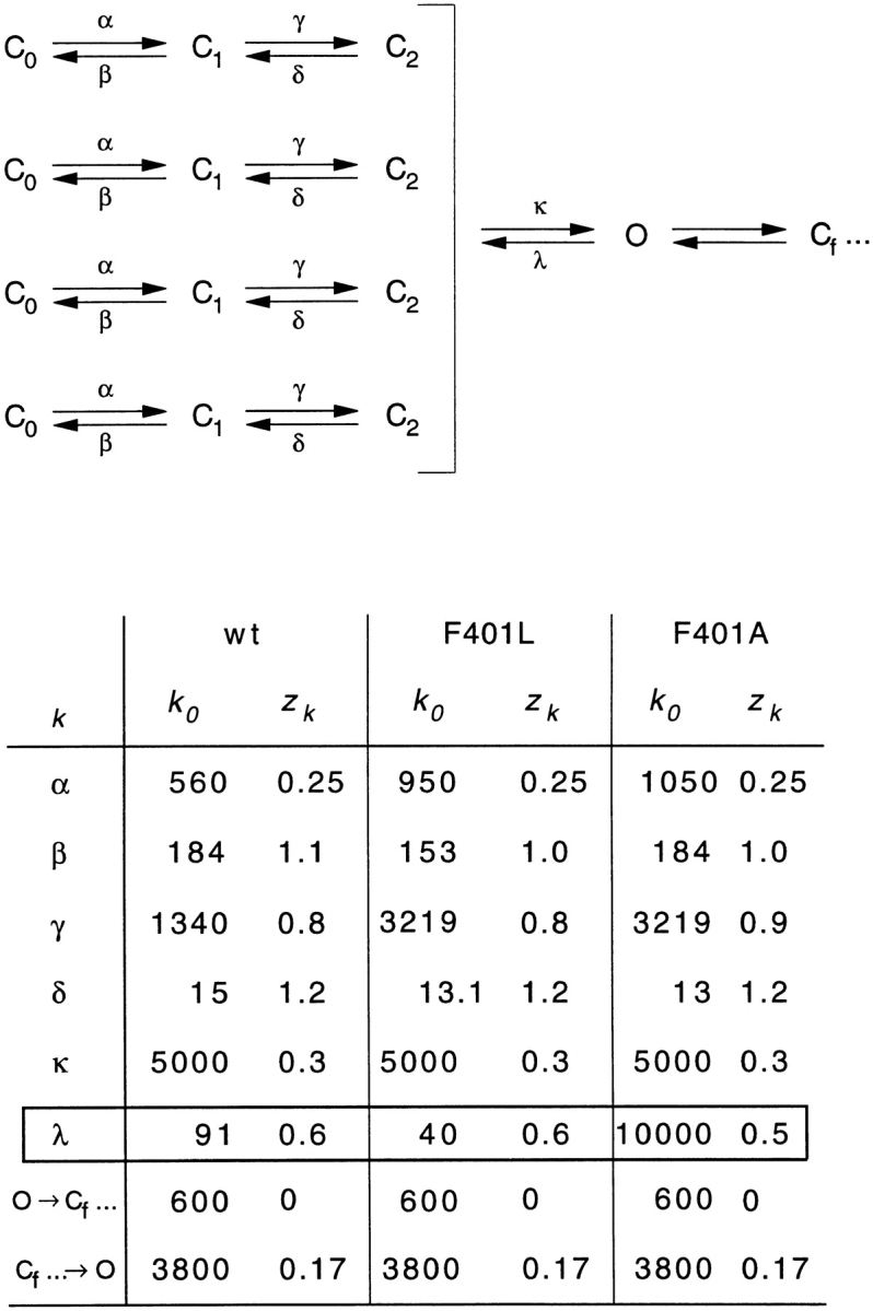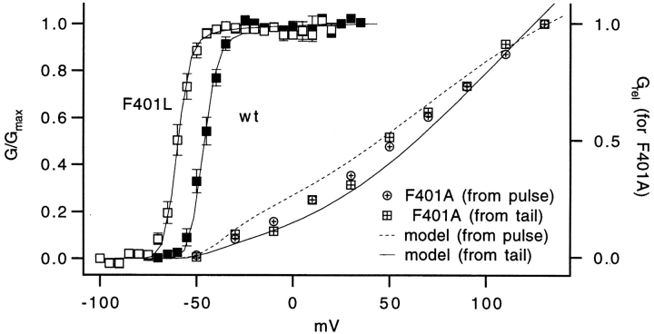 The best-known Shaker allele of Drosophila with a novel gating phenotype, Sh(5), differs from the wild-type potassium channel by a point mutation in the fifth membrane-spanning segment (S5) (Gautam, M., and M.A. Tanouye. 1990. Neuron. 5:67-73; Lichtinghagen, R., M. Stocker, R. Wittka, G. Boheim, W. Stühmer, A. Ferrus, and O. Pongs. 1990. EMBO [Eur. Mol. Biol. Organ.] J. 9:4399-4407) and causes a decrease in the apparent voltage dependence of opening. A kinetic study of Sh(5) revealed that changes in the deactivation rate could account for the altered gating behavior (Zagotta, W.N., and R.W. Aldrich. 1990. J. Neurosci. 10:1799-1810), but the presence of intact fast inactivation precluded observation of the closing kinetics and steady state activation. We studied the Sh(5) mutation (F401I) in ShB channels in which fast N-type inactivation was removed, directly confirming this conclusion. Replacement of other phenylalanines in S5 did not result in substantial alterations in voltage-dependent gating. At position 401, valine and alanine substitutions, like F401I, produce currents with decreased apparent voltage dependence of the open probability and of the deactivation rates, as well as accelerated kinetics of opening and closing. A leucine residue is the exception among aliphatic mutants, with the F401L channels having a steep voltage dependence of opening and slow closing kinetics. The analysis of sigmoidal delay in channel opening, and of gating current kinetics, indicates that wild-type and F401L mutant channels possess a form of cooperativity in the gating mechanism that the F401A channels lack. The wild-type and F401L channels' entering the open state gives rise to slow decay of the OFF gating current. In F401A, rapid gating charge return persists after channels open, confirming that this mutation disrupts stabilization of the open state. We present a kinetic model that can account for these properties by postulating that the four subunits independently undergo two sequential voltage-sensitive transitions each, followed by a final concerted opening step. These channels differ primarily in the final concerted transition, which is biased in favor of the open state in F401L and the wild type, and in the opposite direction in F401A. These results are consistent with an activation scheme whereby bulky aromatic or aliphatic side chains at position 401 in S5 cooperatively stabilize the open state, possibly by interacting with residues in other helices.