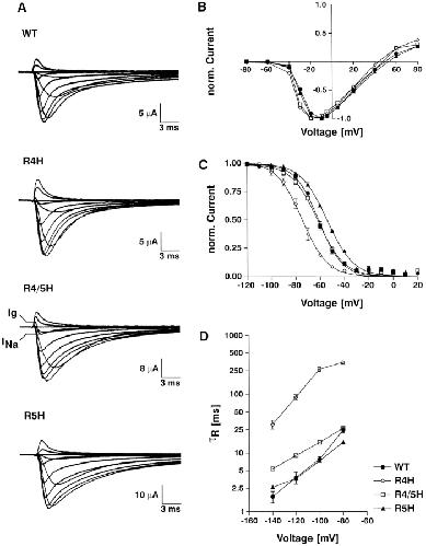 Figure 1. Effects of S4D4 point mutations on macroscopic Na+ currents. (A) Na+ currents from WT-, R4H-, R4/5H-, and R5H-injected Xenopus oocytes elicited by step depolarizations from −80 to 80 mV, holding potential −100 mV. A single trace displaying an outward gating current followed by an inward ionic current near sodium reversal potential is indicated in R4/5H. (B) Corresponding current–voltage relationship of peak Na+ currents, normalized to the largest inward current. (C) Steady-state inactivation at 0 mV induced by a 100-ms prepulse at voltages between −120 and 20 mV, increments of 10 mV, holding potential −100 mV. The curves are fitted to a standard Boltzmann distribution with slopes and V0.5 given in the text. Values are mean ± SEM of n > 3 cells. (D) Semilogarithmic plot of time constant and voltage of recovery from fast inactivation. Pulse protocol: a 80-ms test pulse to 0 mV was preceded by a 100-ms pulse to 0 mV and variable recovery periods at four different holding potentials (−80, −100, −120, and −140 mV). Values are mean recovery time constants in milliseconds ± SEM of n = 1–7 cells; WT, 1.8 ± 0.6 (−140 mV), 3.9 ± 1.8 (−120 mV), 7.9 ± 1.5 (−100 mV), 24.8 ± 6.0 (−80 mV); R4H, 30.8 ± 9.6 (−140 mV), 89.4 ± 19.3 (−120 mV), 264 ± 59 (−100 mV), 347 ± 55.1 (−80 mV); R4/5H, 5.4 ± 0.5 (−140 mV), 9.1 ± 0.9 (−120 mV), 15.1 ± 0.8 (−100 mV), 26.7 ± 1.8 (−80 mV); R5H, 2.6 (−140mV), 3.7 ± 0.2 (−120 mV), 7.4 ± 0.6 (−100 mV), 15.4 ± 0.9 (−80 mV). |