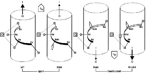 Figure 9. Scheme of possible interactions of the central arginines of S4D4 with a putative counter-charge that could explain the different inactivation behavior of the mutants. Illustrated is the central section of S4D4 containing the highly conserved central arginines R3–R6; the hypothetical negative counter-charge is indicated. WT and R5H are shown in the open state and R4H and R4/5H are shown in the inactivated state. Compared with WT, the O → I transition is considerably slowed in R5H (indicated by a thin arrow) and moderately slowed in R4H (not illustrated). This is due to the electrostatic asymmetry resulting from the interaction of the negative counter-charge with the neighbored arginines and histidines in the single mutants. On the other hand, the I2 → C2 transition (recovery from inactivation) is for the same reason drastically slowed in R4H (indicated by a thin arrow) and hardly affected in R5H (not illustrated). In contrast, WT and R4/5H display more symmetrical electrostatics, but due to the considerably altered structure in the double mutant, the mobility of S4D4 is slowed in both directions. |