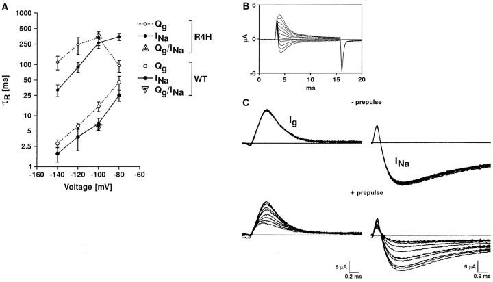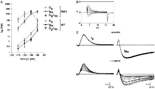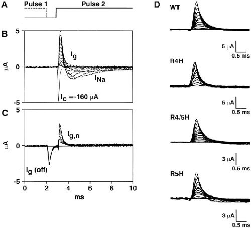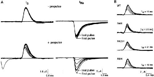 Figure 5. Recovery from fast inactivation of macroscopic ionic and gating currents. (A) Recovery of WT gating current (Ig, in the presence of 2 μM TTX) and ionic current (INa, in the absence of TTX) obtained from different oocytes. Pulse protocol: a 100-ms prepulse to 0 mV from a holding potential of −100 mV was followed by a recovery period of variable duration (2–90 ms) at −100 mV. Test pulses have a duration of 80 ms (ionic current) or 13 ms (gating current) and responses are superimposed for all recovery periods. For the calculation of the recovery time course, the current traces with prepulse were routinely normalized to the current traces without prepulse in order to compensate the slight decrease of the current amplitude during pulse series. The series of increasing recovery times, starting from 2 ms, where INa is almost totally inactivated, was preceded by the longest recovery time where the plateau of recovery is observed (first and last pulses are indicated in INa recordings). (B) Gating current recovery of WT and mutant sodium channels at −100 mV. Pulse protocol was as described above. The time intervals for recovery were between 10 and 1,250 ms for R4H and between 2 and 90 ms for WT and the other mutant channels. The recovering gating charges were fitted to a single exponential with corresponding recovery time constants (τR) as indicated. Notice the different levels of the nonimmobilized gating current fraction at the onset of recovery, reflecting the different degrees of immobilization. |