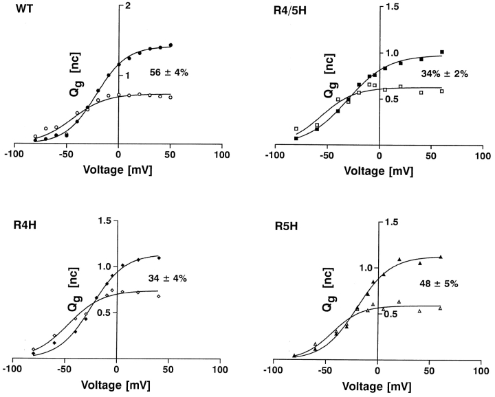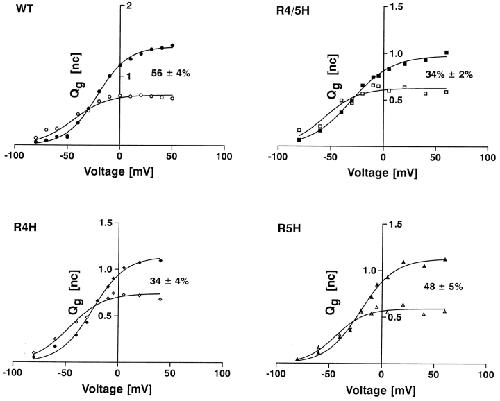 Figure 4. Charge–voltage (Q/V) distributions in WT and mutant sodium channels. Open symbols are data obtained in the presence of a 20-ms inactivating prepulse to 0 mV (1-ms interval at −100 mV). Filled symbols are data without prepulse; test pulses were 13 ms long. The gating charge (Qg) represents the time integral of the corresponding gating current. The individual Q/V curves were fitted by a Boltzmann distribution as described in Table . The degree of immobilization at Qmax derived as mean value ± SD from Table is indicated in each diagram. |