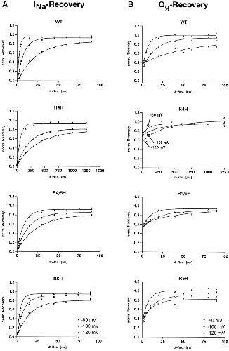 Figure 6. Comparison of the recovery of ionic current and gating charge of WT and mutant sodium channels at different potentials. Sodium current recovery (left panel) and gating charge recovery (right panel) at recovery potentials of −80, −100, and −120 mV in WT-, R4H-, R4/5H-, and R5H-sodium channels. The data of each subdiagram were recorded from different oocytes and normalized as described in Fig. 5. Notice the different starting points of gating current recovery in R4H that strictly depend on the effective recovery potential (indicated by arrows). Corresponding sodium current (INa) and gating charge (Qg) recovery time constants obtained from single exponential fits are as follows (INa/Qg in ms): WT, 22.8/54.9 (−80 mV), 7.6/16.7 (−100 mV), 2.1/6.4 (−120 mV); R4H, 359/113 (−80 mV), 228/269 (−100 mV), 59.7/349 (−120 mV); R4/5H, 25.4/39.7 (−80 mV), 14.9/20.6 (−100 mV), 8.4/9.5 (−120 mV); R5H, 16.3/12.6 (−80 mV), 8.0/11.6 (−100 mV), 3.8/6.9 (−120 mV). |