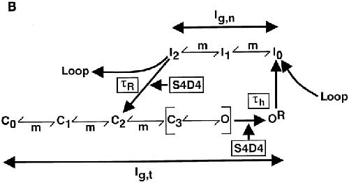 Figure 8. Model of sodium channel fast inactivation controlled by S4D4. (A) Schematic illustration of our interpretations and conclusions displaying the relevant structures of the sodium channel and their movements at closed, open, and inactivated states as well as during recovery from inactivation. The positively charged amino acids of the S4 voltage sensors in domains 2–4 and the analyzed mutations in S4D4 are indicated. R symbolizes the putative receptor site in the S4–S5 linker of domain 4, which binds the docking region (D) of the inactivation loop connecting domains 3 and 4 (L3–4), leading to fast inactivation of the channel. Moreover, the position of L3–4 during inactivation causes the partial immobilization of the voltage sensors (most probably S4D4 and S4D3; see discussion), which is indicated here as blockade of m by B. (B) State diagram with lower level reflecting the voltage-dependent activation pathway from several closed (C) to the open state (O) and further to the open state (OR), which presents the receptor instantly followed by the voltage-independent binding of L3–4. The upper level reflects the transitions between several inactivated states producing the nonimmobilized gating current fraction. For recovery from fast inactivation, hyperpolarization causes the reverse movement of S4D4, which disrupts the connection of the inactivation loop to its receptor and simultaneously causes the partial immobilization of the voltage sensors, thereby permitting the return of the channels into the resting (closed) state. |