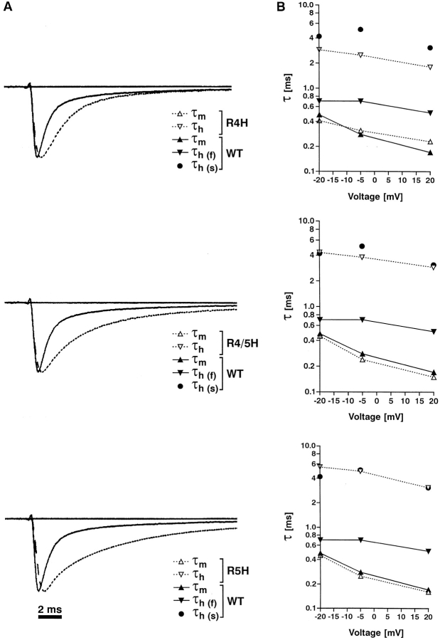 Figure 2. Effects of S4D4 point mutations on kinetics and on voltage dependence of macroscopic Na+ currents. (A) Comparison of normalized single current traces of WT (solid line) and mutant (dotted line) channels, elicited by a depolarizing pulse to −5 mV from a −100-mV holding potential. The settling times of the corresponding capacitance transients are almost identical (data not shown). (B) Semilogarithmic plots of single (mutants) or double (WT inactivation) exponential fits, as indicated, from representative current traces elicited by depolarizing pulses to −20, −5, and 20 mV; holding potential −100 mV. Single fits accord to the following equation. INa(t) = A * (1 − exp (−t/τm))3*exp(−t/τh) + P * (1 − exp(−t/τm))3. WT: (τm/τh (fast)/τh (slow) in ms) 0.48/0.70/4.20 (−20 mV); 0.28/0.70/5.10 (−5 mV); 0.17/0.51/3.10 (20 mV); R4H: (τm/τh in ms) 0.41/2.90 (−20 mV); 0.31/2.50 (−5 mV); 0.23/1.80 (20 mV); R4/5H: (τm/τh in ms) 0.45/4.30 (−20 mV); 0.24/3.80 (−5 mV); 0.15/2.90 (20 mV); R5H: (τm/τh in ms) 0.45/5.50 (−20 mV); 0.25/4.90 (−5 mV); 0.16/3.10 (20 mV). |