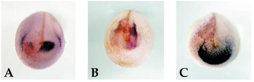 FIG. 7. Disruption of anterior neural gene expression in vivo by Dlx3. Embryos were injected in a single dorsal animal blastomere at the
