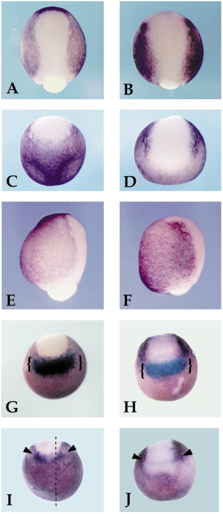 hybridizations in situ were performed with Xag1 (brackets, G, H) and BF-1 (arrowheads, I, J). In the extreme anterior neural plate region,