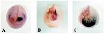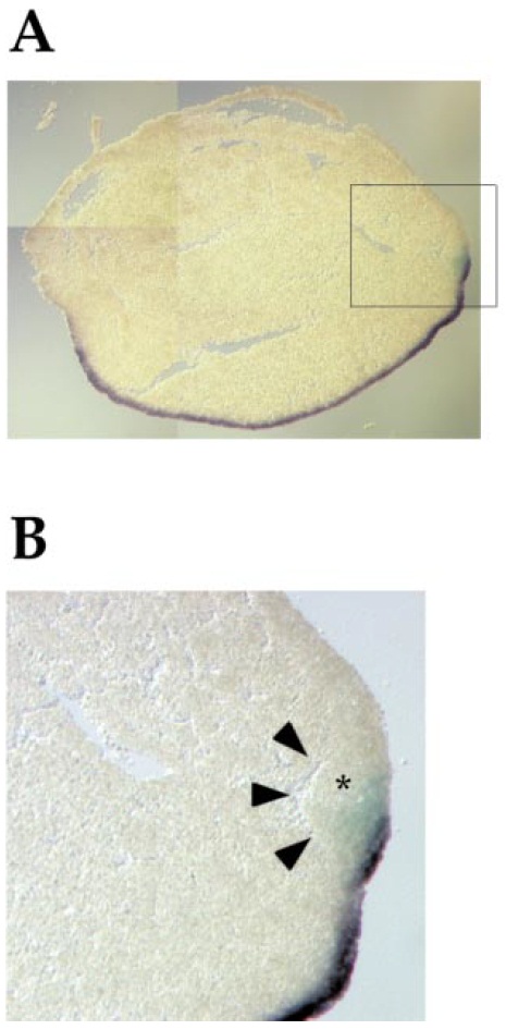 (C). The salmon-gal staining is pinkish-red, and the hybridization staining is purple. The co-injected side is to the left, and the uninjected