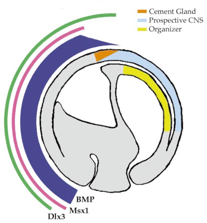 from the leading edge of organizer tissue (yellow). Dlx3 (green) is also ventrally expressed but the domain extends from a point farther from