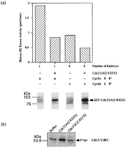 FIG. 5. Phosphorylation and deactivation of Cdc2/Cdk2 following injection of catalytically inactive Cdc25A. (a) Effect of Cdc25A (C432A)