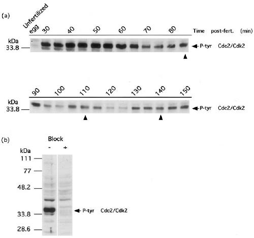 FIG. 6. Periodic Tyr15 phosphorylation of Cdc2/Cdk2 after fertilization. (a) Western blot analysis. Embryo extracts, prepared at the