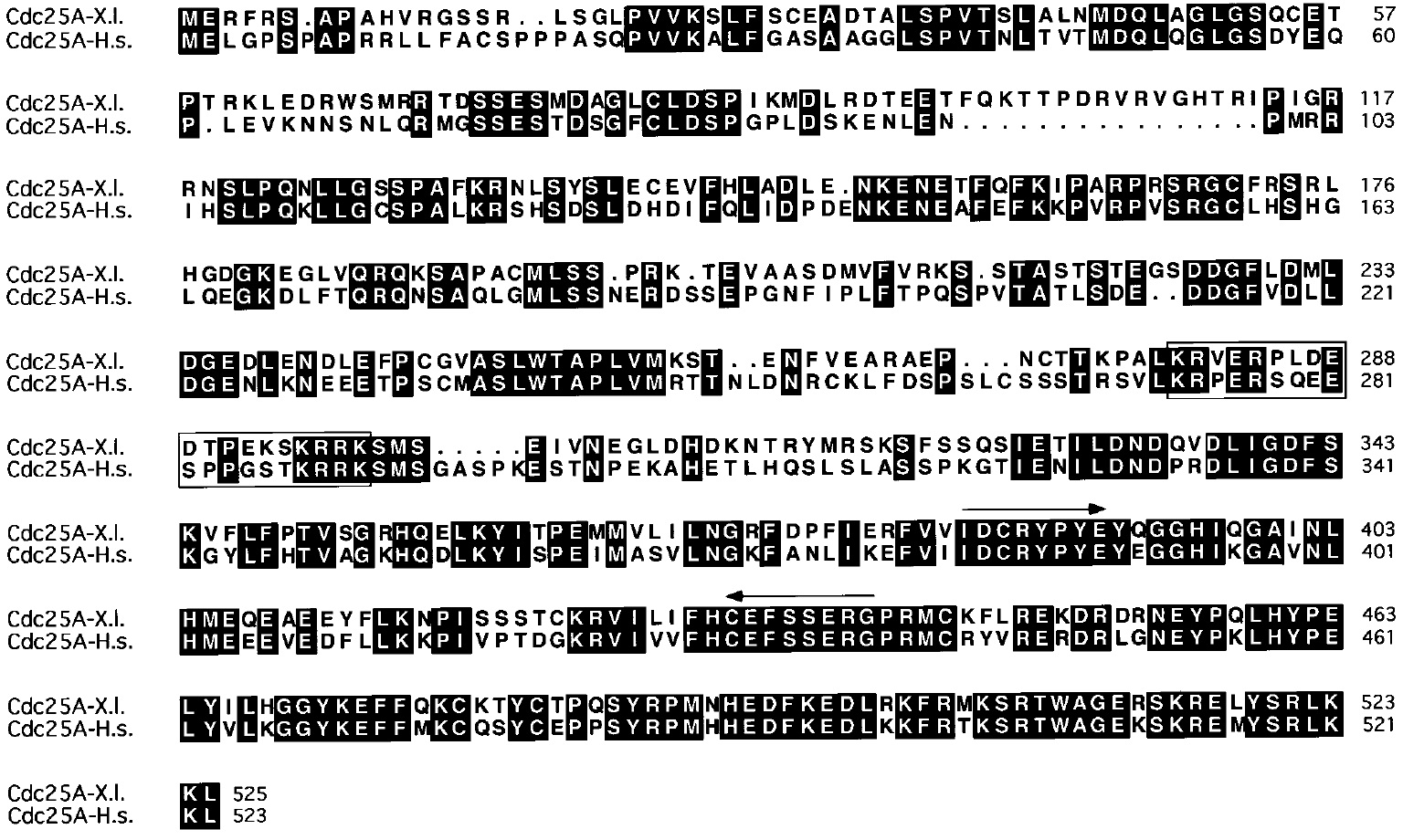 FIG. 1. Comparison of human and Xenopus Cdc25A. The predicted amino acid sequence of the Xenopus Cdc25A (525 residues) cloned as
