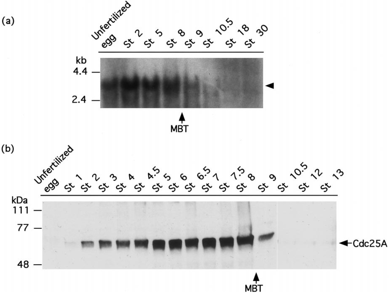 FIG. 2. Maternal expression of Xenopus Cdc25A. (a) Northern blot analysis. Total RNA (20 mg) was prepared from unfertilized eggs and