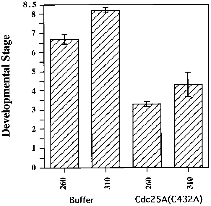 Cdc25A (C432A) protein or buffer was injected into one-cell embryos as in (b) and photographed when the buffer-injected embryos reached
