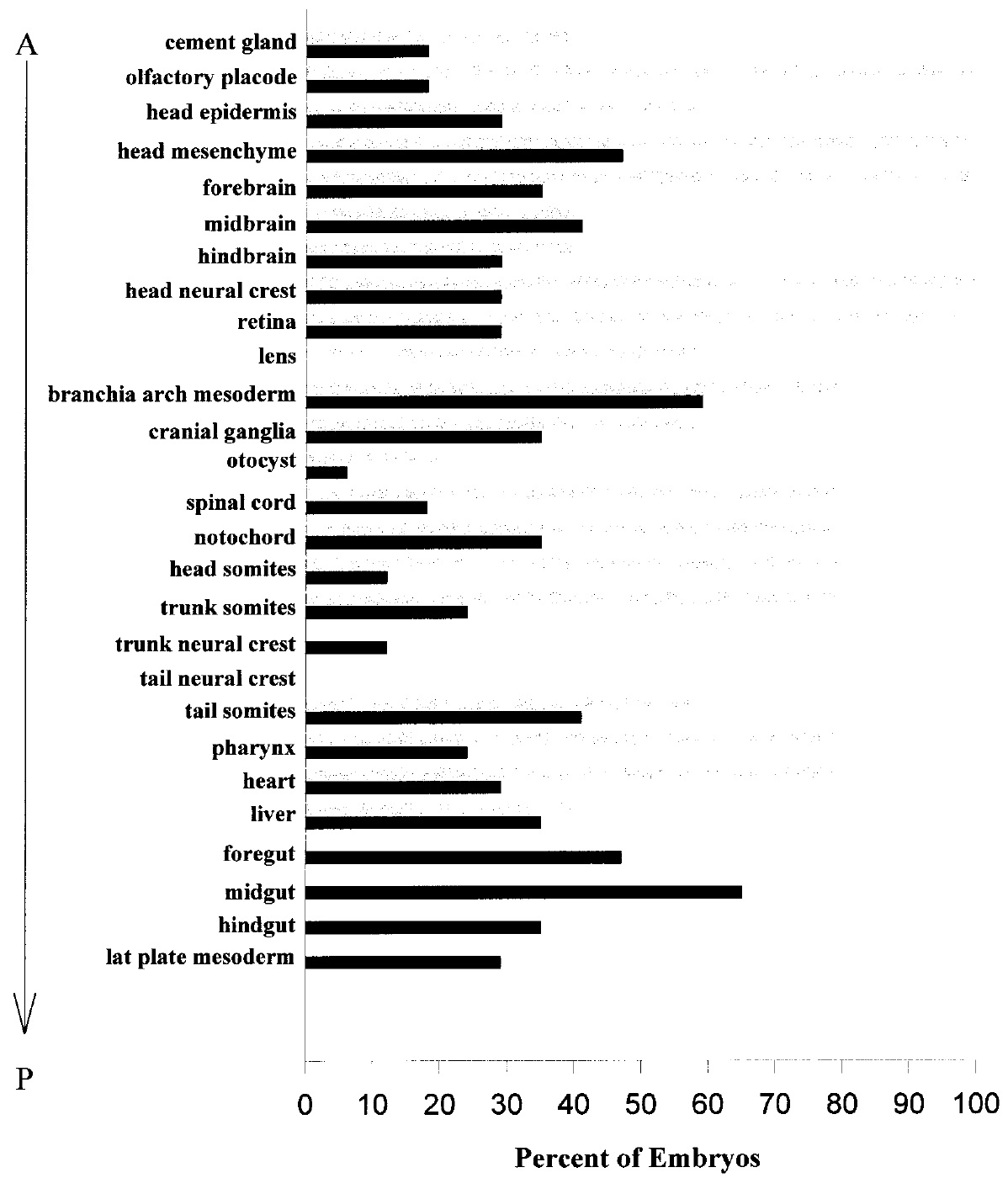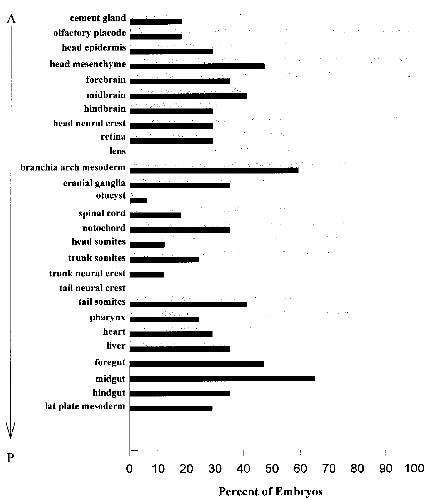 tissues including retina and other CNS derivatives. All but the most anterior tissues (i.e., cement gland, olfactory placode) contain some