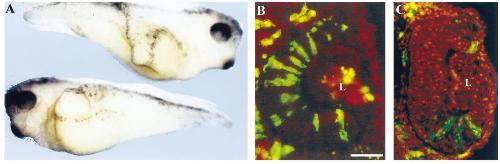 V2.1.1 descendents. (B) Transverse section through the lower embryo in (A) at the level of the secondary axis showing an ectopic retina and