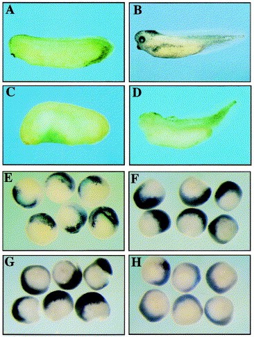 four-cell stage (C,D) were left to develop till tailbud (A,C) or tadpole stages (B,D). Injected embryos show de®cient dorsal axis development, resulting in the absence of cement gland and eye (C,D). Embryos were injected with 6 ng of DWnt-4 mRNA into the marginal zone of dorsal blastomeres at the four cell stage, left to develop until the early gastrula stage and stained for chd (E), gsc (F), otx2 (G) and Xnr3 (H) transcripts. Comparison with expression in non-injected embryos (not shown) indicates that the organiser genes are normally transcribed.