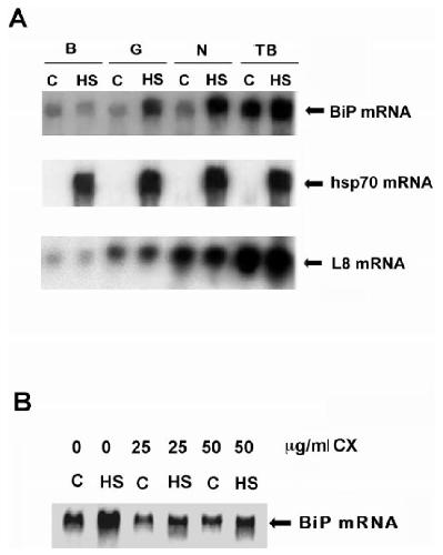 Fig. 4. Effect of heat shock on the accumulation of BiP, hsp70 and