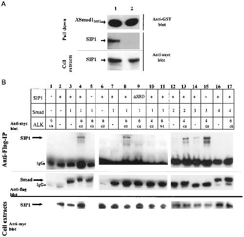 cell extracts using monoclonal anti-myc antibody (lower panel), respectively. B, ligand-dependent interaction of SIP1 with full-length Smads in