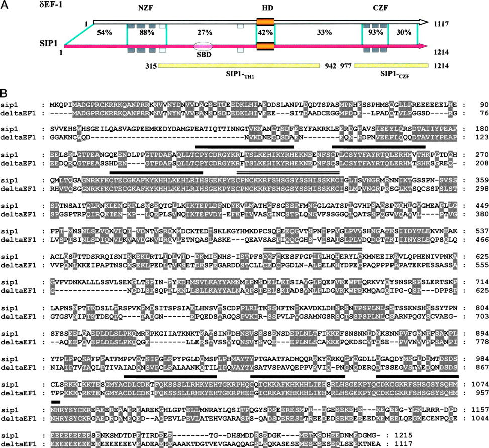 AF033116. B, amino acid sequence comparison between mouse SIP1 and mouse dEF1. Gray boxes reflect identical or biochemically similar amino