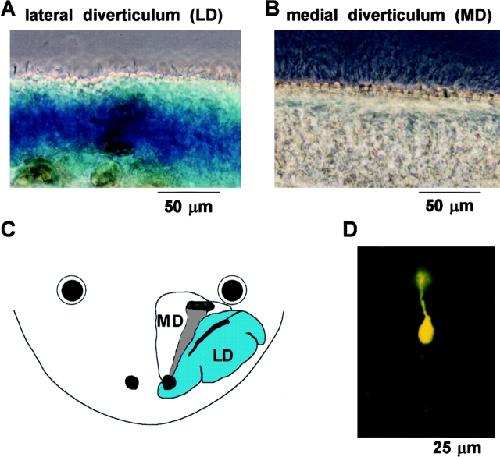 Figure 1. Xenopus laevis olfactory receptor neurons in the sensory epithelium. Light microscopic photomicrographs of slices of olfactory epithelia in the lateral diverticulum (A) and in the medial diverticulum (B) after the frog was cultured in 0.1% methylene blue water for 6 h. (C) A schema of the olfactory organ of Xenopus laevis. (D) An olfactory receptor neuron in the lateral diverticulum dialyzed with 1% Lucifer yellow. The knoblike structure, long dendrite, axon, and soma are visible.